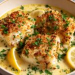 This Baked Cod in Coconut Lemon Cream Sauce recipe delivers a light, flavorful seafood dish featuring tender cod fillets baked in a creamy, tangy coconut and lemon sauce. Perfect for a quick and healthy dinner, it combines the richness of coconut cream with the freshness of lemon and parsley, making for a deliciously satisfying meal that’s ready in just 25 minutes.