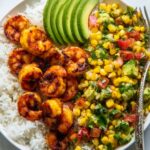 - Assemble the Rice Bowls: Divide steamed white or brown rice among serving bowls. Top each with the chipotle garlic shrimp, a generous scoop of mango avocado salad, and finish with roasted corn. Serve immediately for best flavor and texture.