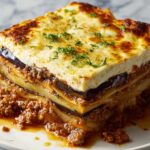Classic Greek Eggplant Moussaka is a hearty and comforting Mediterranean casserole featuring layers of tender roasted eggplant, a spiced ground meat sauce, and creamy béchamel topping. It’s a perfect dish for family dinners or special occasions, delivering robust flavors of cinnamon, allspice, and nutmeg in a satisfying baked casserole.