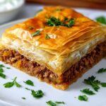 A savory Greek Phyllo Meat Pie featuring ground beef or lamb, aromatic spices, and creamy feta cheese wrapped in buttery, flaky phyllo dough. This classic Mediterranean main course offers a delicious blend of tender meat filling and crisp pastry, perfect for a comforting family dinner or special occasion.
