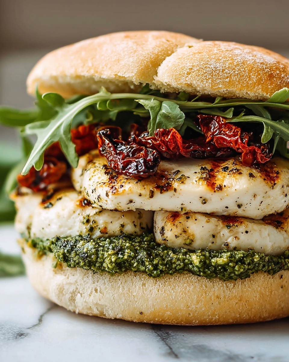 Spread a generous tablespoon of pesto on the bottom half of each toasted roll. Layer on the grilled chicken, followed by a slice of fresh mozzarella, ripe tomato slices, and a handful of arugula or spinach. Top with the other half of the roll, press gently, and serve immediately for the best melt and freshness.