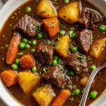 This hearty beef stew recipe features tender, slow-simmered beef cubes cooked with a medley of vegetables, herbs, and a rich broth infused with tomato paste and optional red wine. Perfect for a comforting meal, this stew is simmered until the meat is melt-in-your-mouth tender and the flavors are deeply developed, then finished with fresh peas and parsley for a burst of freshness.