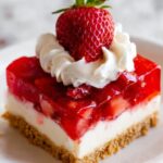 5. Assemble the Salad: Spread the cream cheese mixture evenly over the cooled pretzel crust, sealing edges to prevent leakage. Pour the partially set Jello and strawberry mixture over the cream cheese layer, arranging strawberries attractively. Refrigerate at least 1 hour until fully set. Serve chilled, cut into squares.