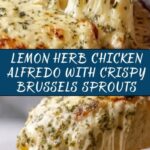 A delightful Lemon-Herb Chicken Alfredo featuring tender chicken breasts seasoned with fresh herbs and lemon zest, served over creamy Alfredo pasta. This dish is complemented by spicy feta cheese and crispy roasted Brussels sprouts tossed with Parmesan for a perfect balance of flavors and textures, making it a satisfying and elegant meal.
