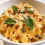 Now it’s time for the heavy cream — whisk it in smoothly and watch the sauce start to thicken. Stir in chopped sun-dried tomatoes, dried oregano, and crushed red pepper flakes to add bursts of sweetness, herbal warmth, and subtle heat. Toss in the shredded chicken and allow everything to simmer until the sauce coats the spoon thickly. This step really lets the flavors mingle and marry together beautifully.
