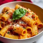 Spicy Basil Rigatoni is a creamy and flavorful Italian-American pasta dish combining tender rigatoni with a rich tomato and basil sauce, enhanced by a touch of heat from red pepper flakes and finished with Parmesan cheese. This easy weeknight meal delivers the perfect balance of spicy, creamy, and fresh flavors.