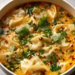 This Thai Potsticker Soup combines crispy pan-fried potstickers with a fragrant, flavorful broth infused with garlic, ginger, lemongrass, and kaffir lime leaves. Enhanced with fresh vegetables like baby bok choy and carrots, and garnished with cilantro, green onions, and optional chilies, this soup offers a perfect balance of savory, tangy, and spicy notes. It’s a comforting bowl ideal for those craving a fusion of Asian flavors and textures in a warm, satisfying meal.