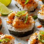 These Viral Easy Salmon Sushi Bake Cups are a delightful fusion appetizer combining the flavors of sushi with the convenience of a baked dish. Featuring seasoned sushi rice, flaky cooked salmon mixed with Japanese mayo and spicy sriracha, all layered in a muffin tin with nori sheets for a crispy seaweed finish. Topped with fresh green onions, sesame seeds, and optional diced avocado or cucumber, these sushi cups are perfect for parties, snacks, or a fun meal. Easy to prepare and bake, they bring sushi flavors to your oven with minimal fuss.