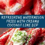 Transfer the coconut lime dip to a pretty serving bowl and if you like, sprinkle some shredded coconut or fresh chopped mint on top for a burst of texture and color. Remove your chilled watermelon fries from the fridge, arrange them on a platter, and you’re ready to indulge in this vibrant, refreshing treat!